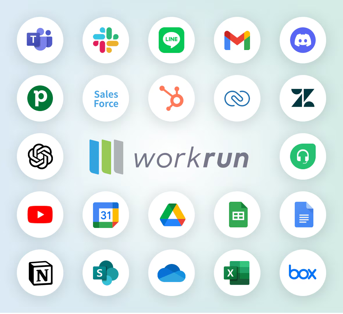 workrunは、主要なSaaSを含む 300以上のツールと連携 できます。 そのため、今使っているツールを削除したり、別のツールへ変更したりする必要はありません。